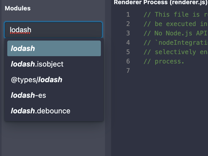 If your experiment depends on third-party modules, you can search for any package available in the npm registry, with autocomplete and version selection powered by Algolia.
